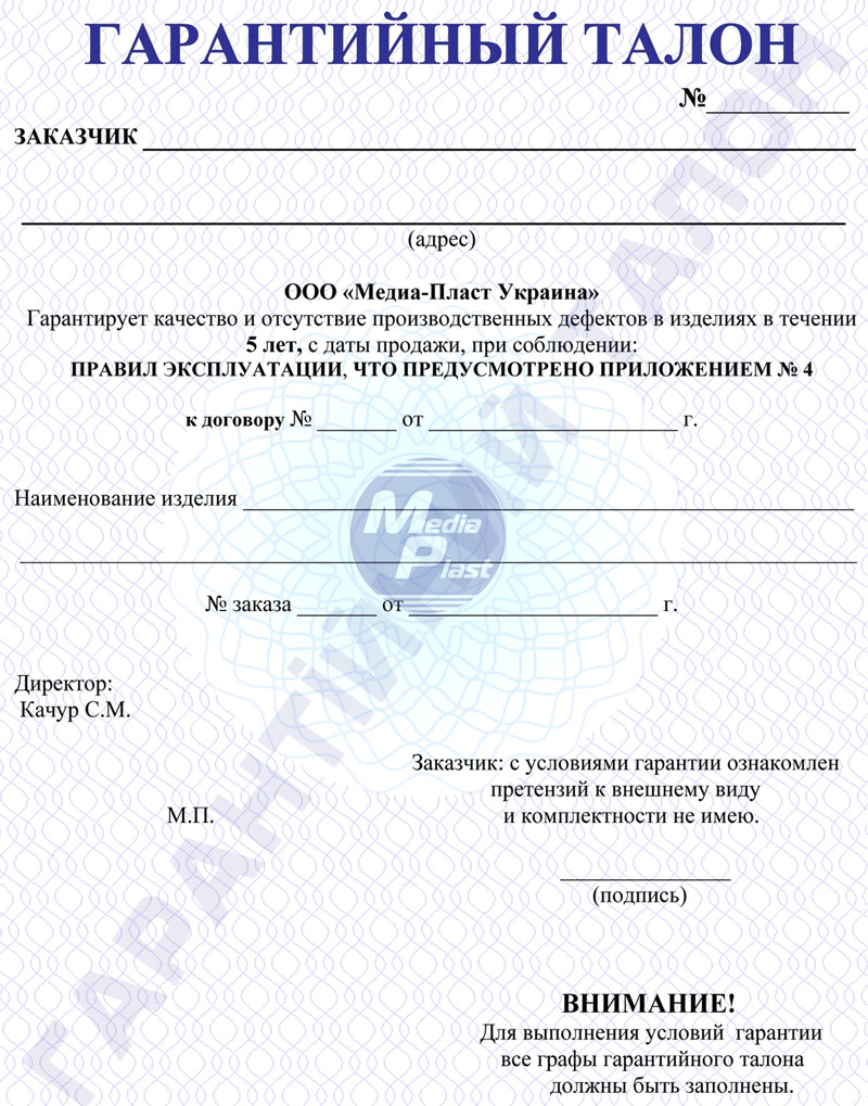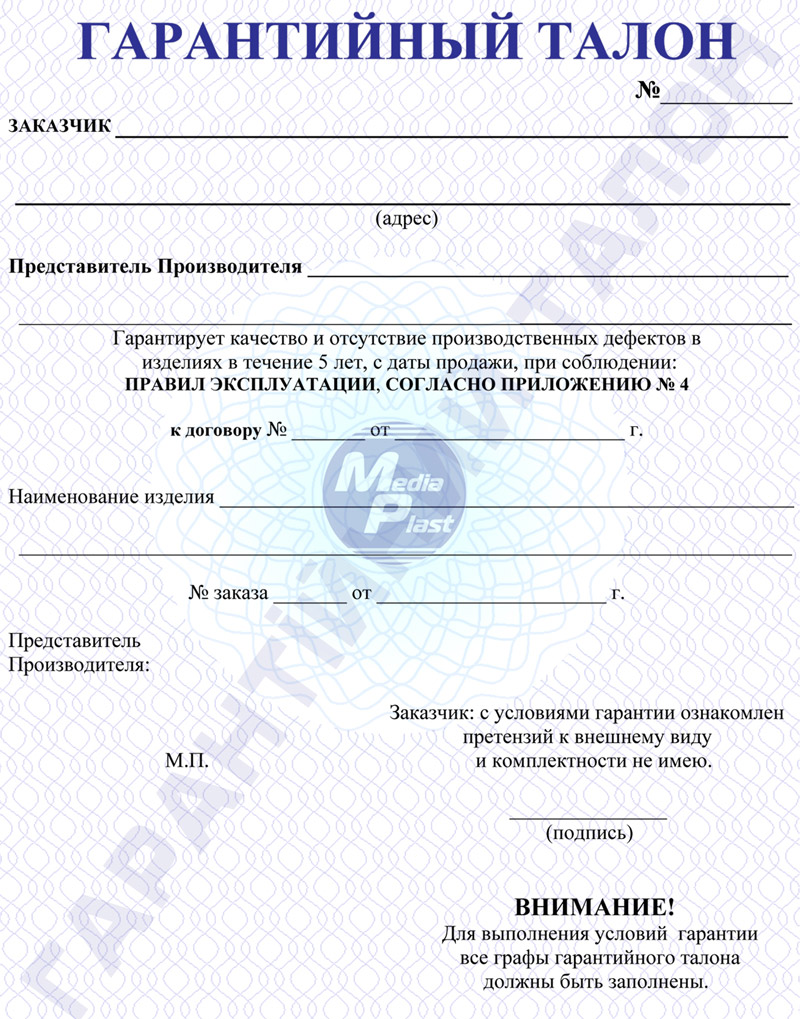 Гарантийный талон от ПРОИЗВОДИТЕЛЯ